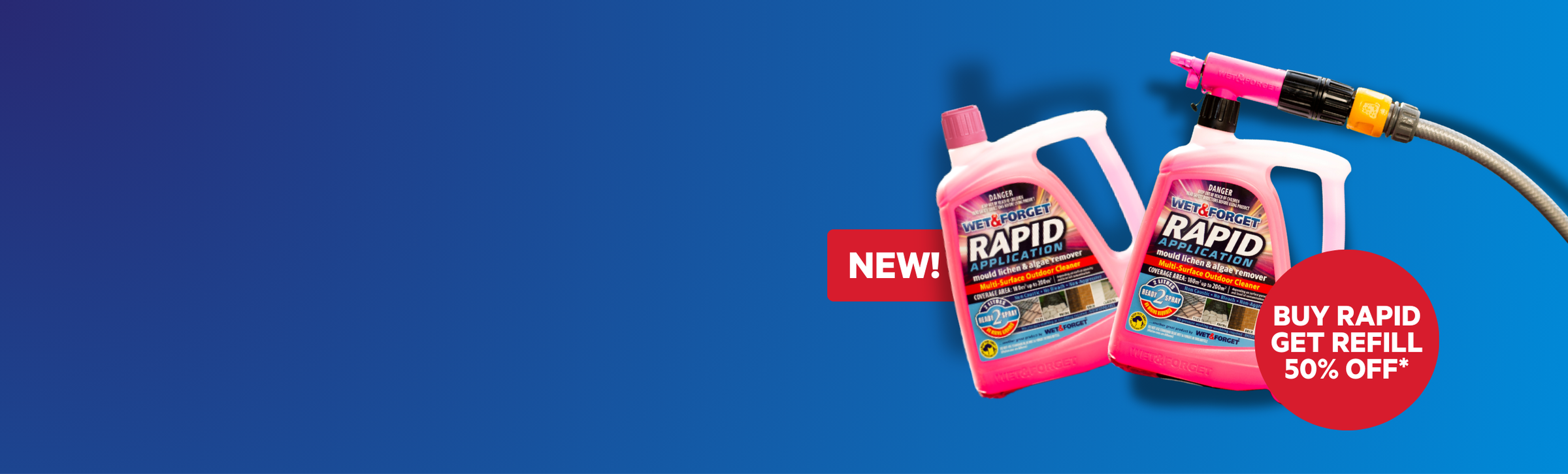 Simplify your cleaning routine with Wet & Forget Rapid Application, the ultimate solution for removing mould, lichen, and algae from outdoor surfaces. With its convenient built-in hose attachment, this ready-to-use formula makes application quicker and easier than ever—no mixing or heavy equipment required.